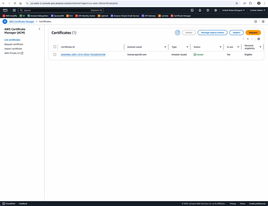 One decision upfront: where you create your certificate matters. For licensing servers, use regional APIs in your primary customer region. They’re simpler to set up and easier to debug than edge-optimized APIs.